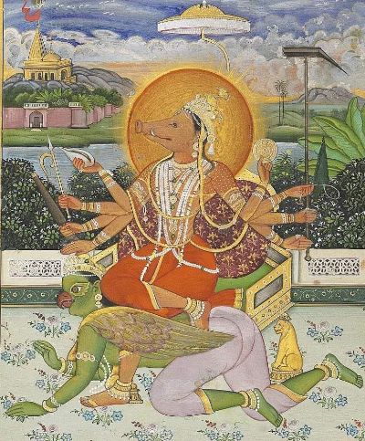 And here is a lovely work of art someone shared at Twitter: it is the god Vishnu as his boar avatar riding on Garuda, his divine bird vahana (vehicle):