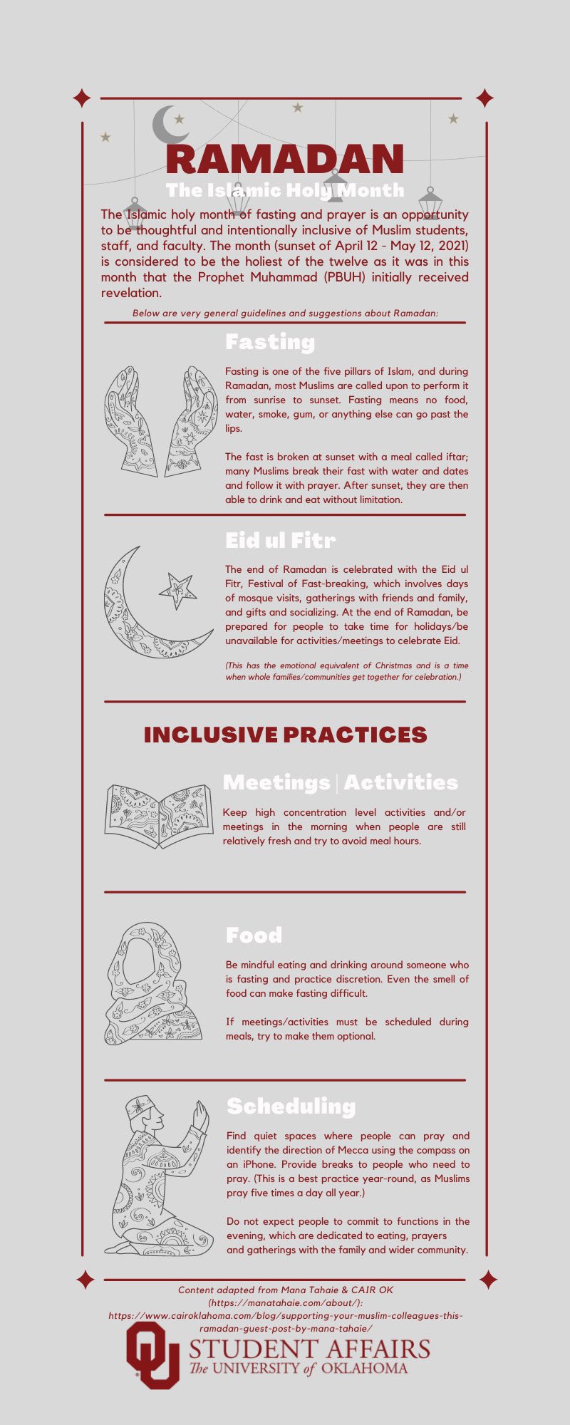 Ramadan. Yesterday evening at sundown marked the beginning of the Muslim celebration of Ramadan, which is a month of fasting and prayer that culminates in the festival of Eid al-Fitr which takes place on the evening of May 12 this year. You can find out more about Ramadan at Wikipedia, and here's an infographic from OU Student Affairs (click that link for a larger version):